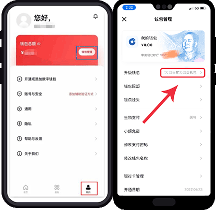 ?、艹晒﹂_通錢包后,選擇首頁“我的”—點擊“錢包管理”—點擊“升級錢包”。