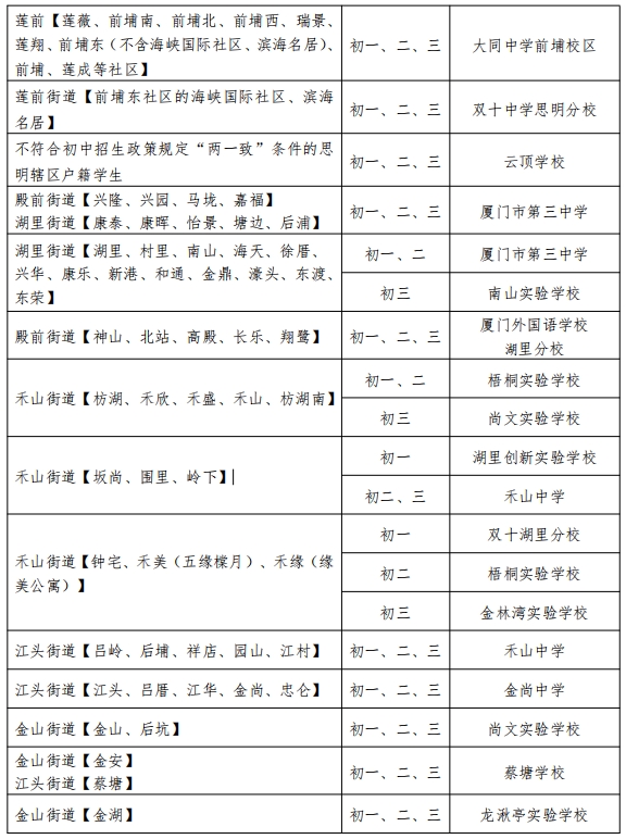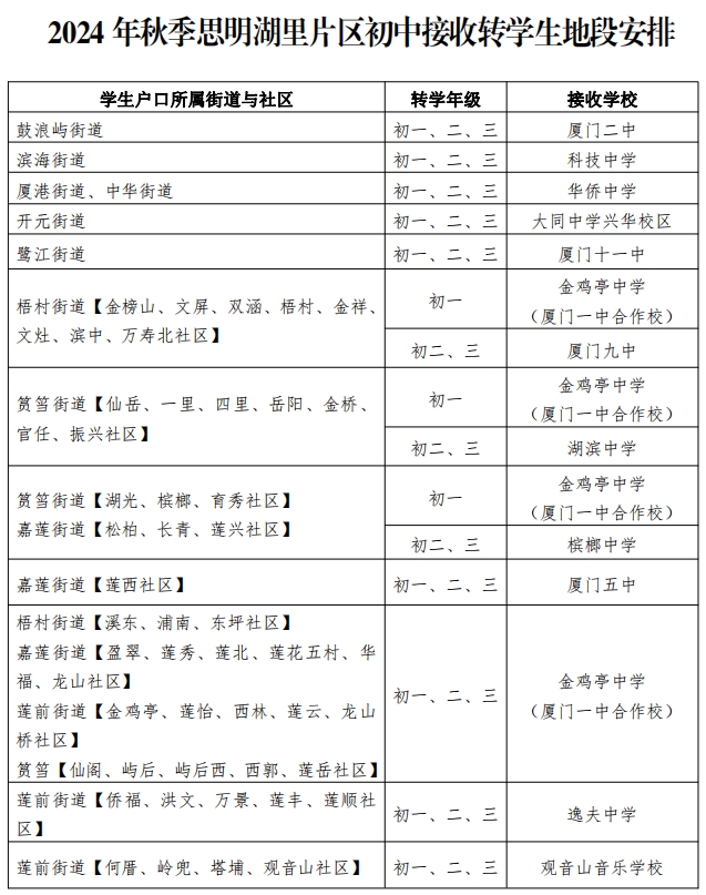 2024年秋季思明湖里片區(qū)初中接收轉(zhuǎn)學生地段安排