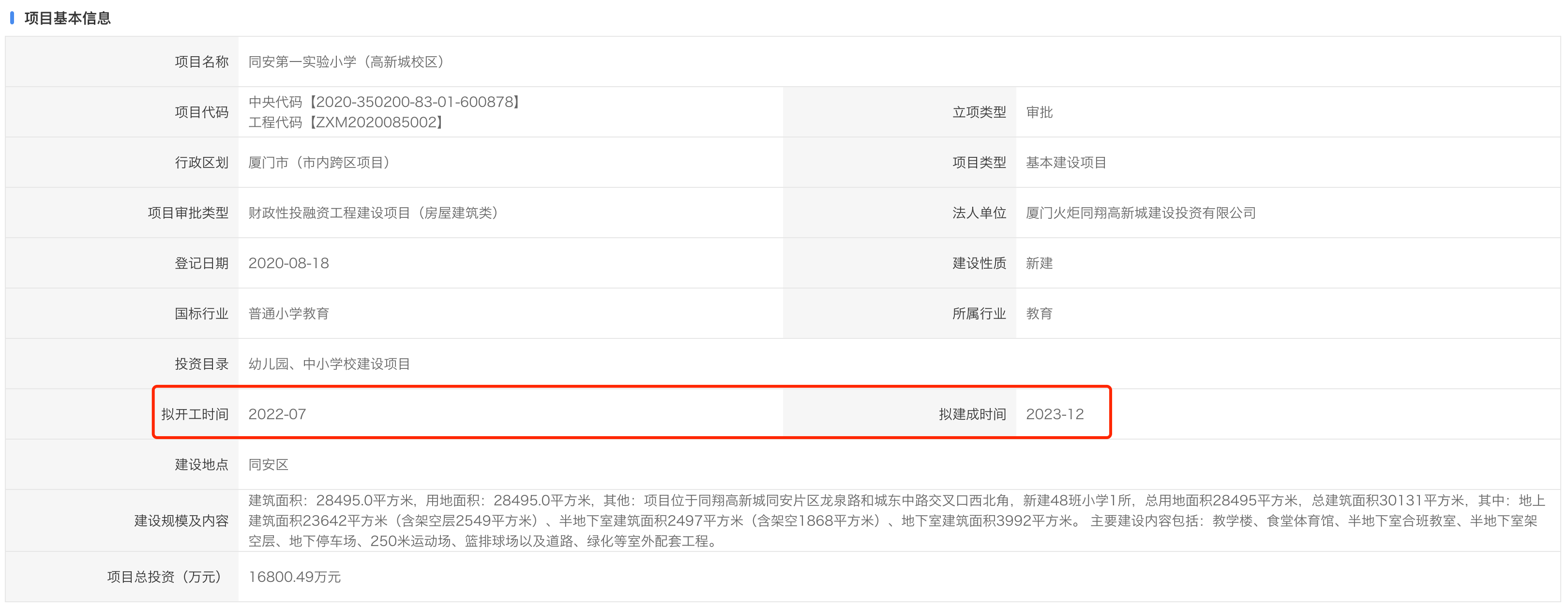 其實(shí)早在2020年8月,同安第一實(shí)驗(yàn)小學(xué)(高新城校區(qū))項(xiàng)目就已報(bào)建,根據(jù)報(bào)建信息可知,該校將于今年7月開建,計(jì)劃2023年12月建成。