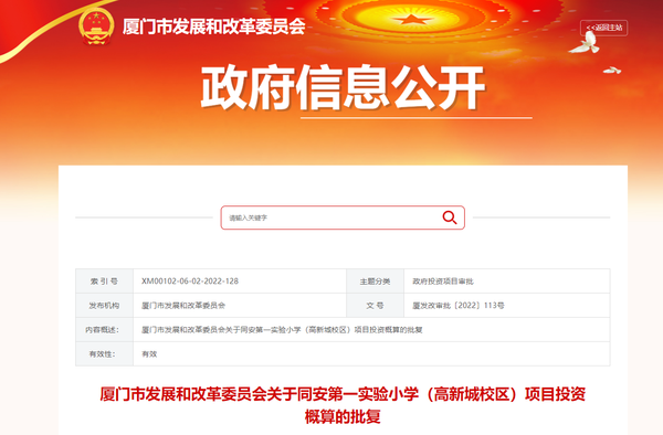 就在剛剛,廈門市發(fā)展和改革委員會(huì)批復(fù)關(guān)于同安第一實(shí)驗(yàn)小學(xué)(高新城校區(qū))項(xiàng)目投資概算。