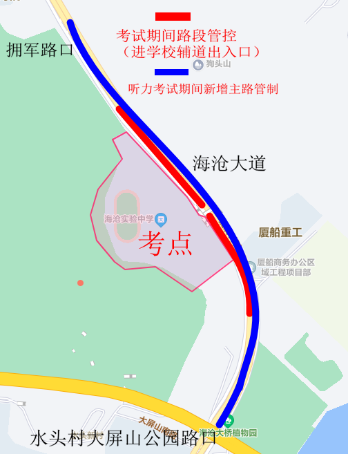 聽力考試期間管制措施:6月8日下午14:45-15:30,英語聽力考試期間,增加3條管制路段興港路東側(cè)輔道(嵩嶼南路口至嵩嶼中路口)、嵩嶼南二路、嵩嶼南路,禁止一切車輛通行。