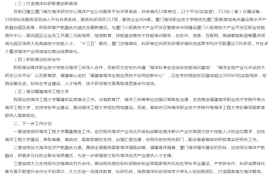 廈門市教育局加快海洋工程大學(xué)籌建和實(shí)質(zhì)推動(dòng)工作。與省教育廳、海洋三所等單位加強(qiáng)日常聯(lián)系溝通,支持推進(jìn)福建海洋職業(yè)技術(shù)學(xué)院升格為海洋工程大學(xué),支持學(xué)校專業(yè)建設(shè),推動(dòng)海洋工程大學(xué)規(guī)劃用地建設(shè)。目前,省政府已將海洋職業(yè)技術(shù)學(xué)院升格海洋工程大學(xué)的事項(xiàng)報(bào)教育部列入國家規(guī)劃。