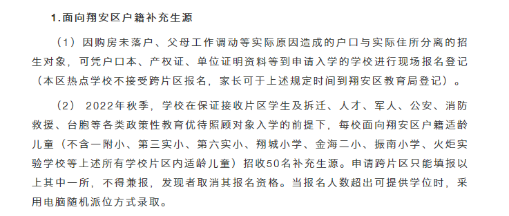 注意,片區(qū)招生對象必須符合“兩一致”,即適齡兒童與父母或者父母一方戶口一致,實(shí)際居住地與戶籍所在地一致(指適齡兒童及其家長在其戶口簿記載的住址與實(shí)際住所一致)。此外,招生方案提到,學(xué)校將面向翔安區(qū)戶籍補(bǔ)充生源。