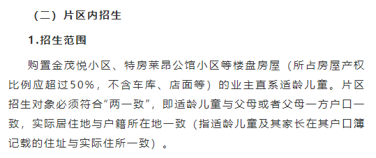 招生方案顯示,一年級招生依據(jù)“劃片招生,就近入學(xué)”的原則,組織招生片區(qū)內(nèi)的戶籍適齡兒童按時就近免試入學(xué)。招生范圍也已經(jīng)明確:為購置金茂悅小區(qū)、特房萊昂公館小區(qū)等樓盤房屋(所占房屋產(chǎn)權(quán)比例應(yīng)超過50%,不含車庫、店面等)的業(yè)主直系適齡兒童。