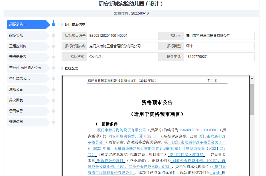近日,同安新城實(shí)驗(yàn)幼兒園(設(shè)計(jì))招標(biāo)公告發(fā)布。