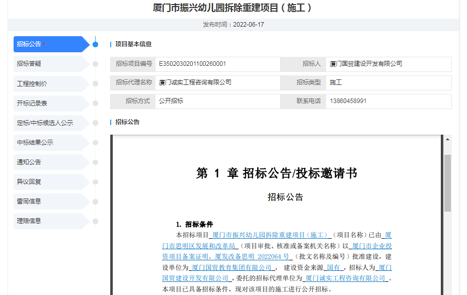 近日,廈門市振興幼兒園拆除重建項目(施工)招標公告發(fā)布。