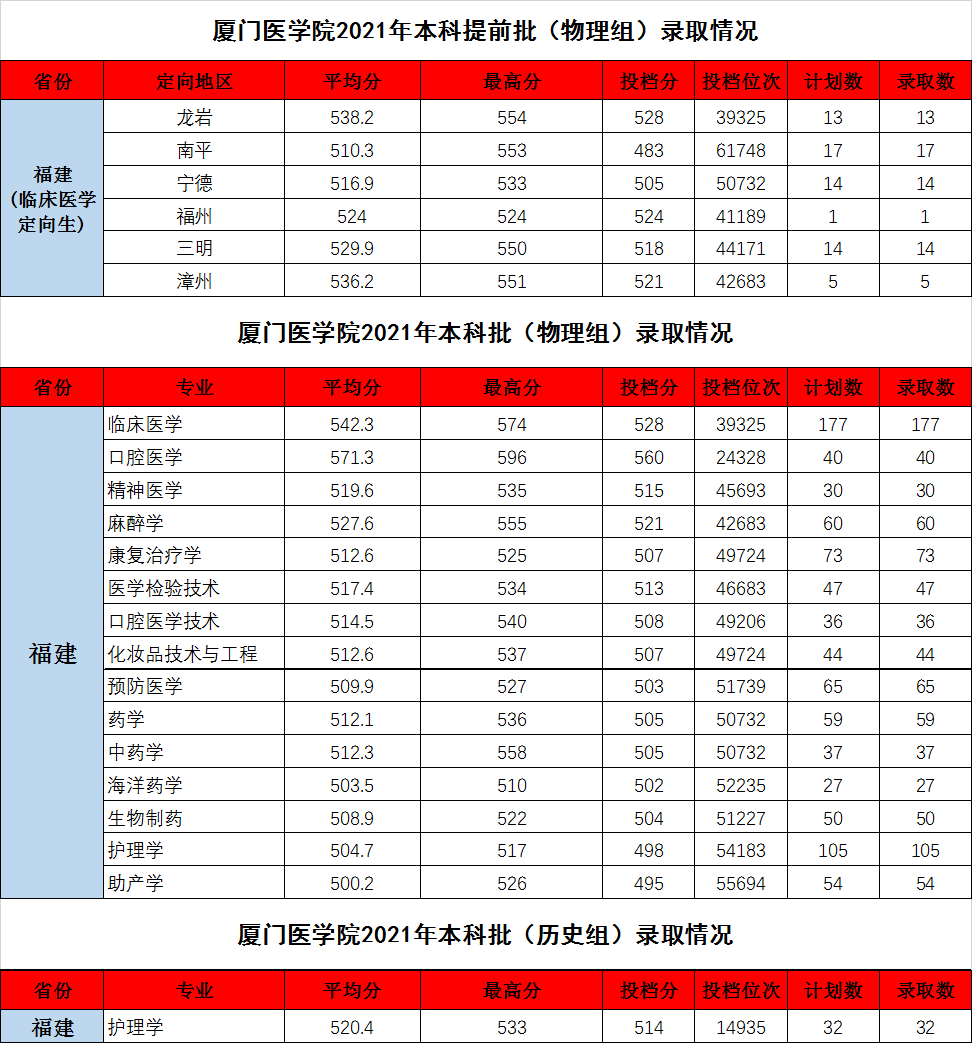 2021年廈門醫(yī)學(xué)院在福建省外錄取情況(普通高考本科)