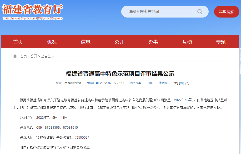 根據(jù)《福建省教育廳關(guān)于遴選培育福建省普通高中特色示范項(xiàng)目促進(jìn)高中多樣化發(fā)展的通知》(閩教基〔2022〕16號),在各地遴選申報基礎(chǔ)上,我廳組織專家組對申報高中特色示范項(xiàng)目進(jìn)行評審,擬確定省級特色示范項(xiàng)目84個。現(xiàn)予以公示,對評審結(jié)果有異議的,可來電來信反映。