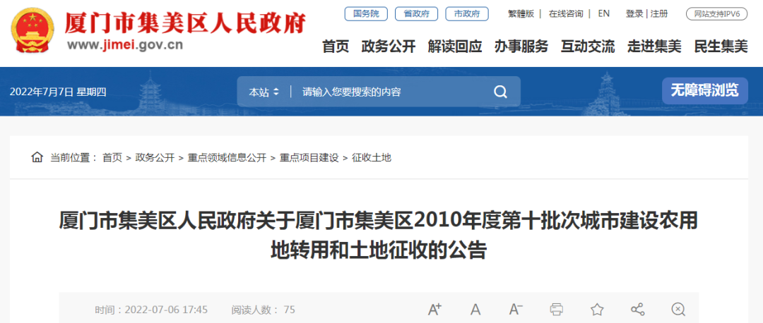 7月6日,廈門市集美區(qū)人民政府發(fā)布關(guān)于廈門市集美區(qū)2010年度第十批次城市建設(shè)農(nóng)用地轉(zhuǎn)用和土地征收的公告。