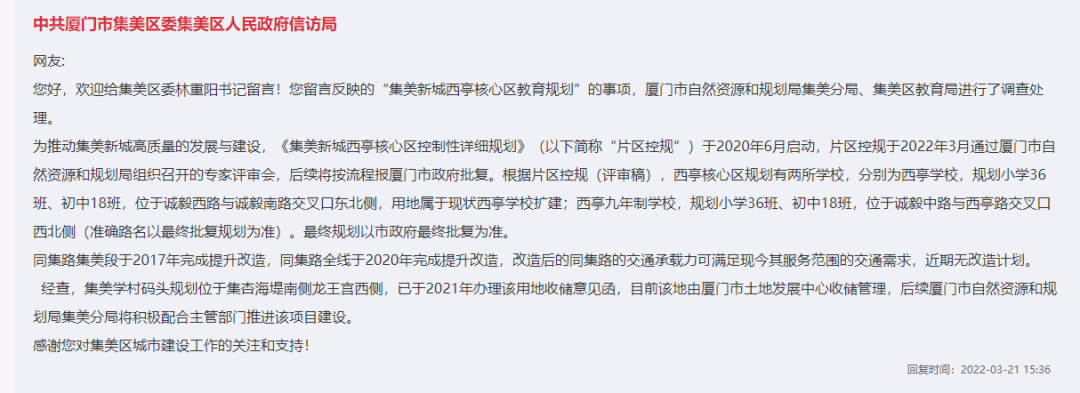 其實(shí),關(guān)于西亭九年制學(xué)校相關(guān)問(wèn)題,早在今年3月就有網(wǎng)友在官方網(wǎng)站詢問(wèn),當(dāng)時(shí),中共廈門市集美區(qū)委集美區(qū)人民政府信訪局回復(fù)表示——