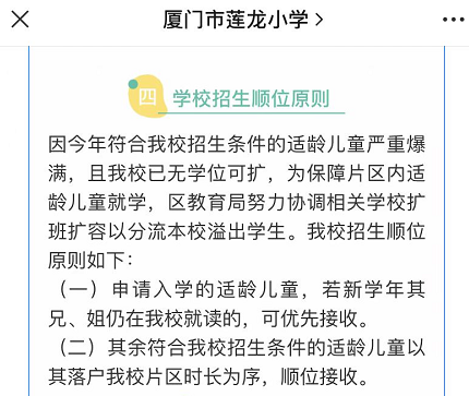 據(jù)悉,今年蓮龍小學(xué)、松柏二小等學(xué)校的招生通告都指出,申請入學(xué)的適齡兒童,若新學(xué)年其兄、姐仍在本校就讀的,可優(yōu)先接收,其中蓮龍小學(xué)指出: