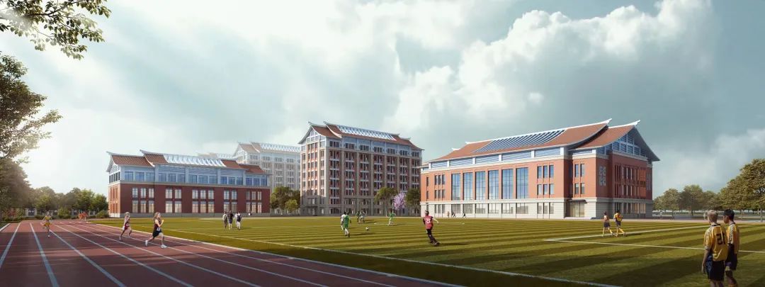 學(xué)校主入口設(shè)置有較大開(kāi)放廣場(chǎng),主體建筑群集中在地塊東北側(cè),室外運(yùn)動(dòng)場(chǎng)在地塊西南側(cè),食堂單獨(dú)設(shè)置于建筑群西側(cè),與宿舍相鄰。