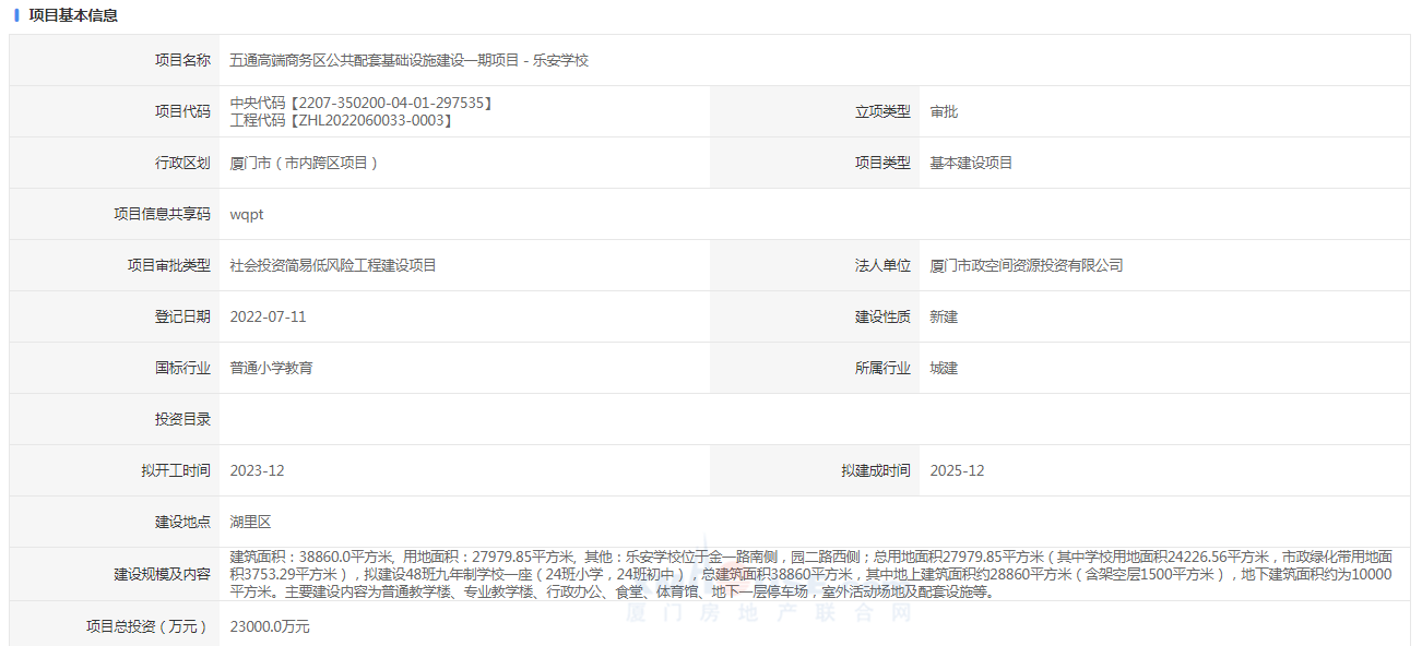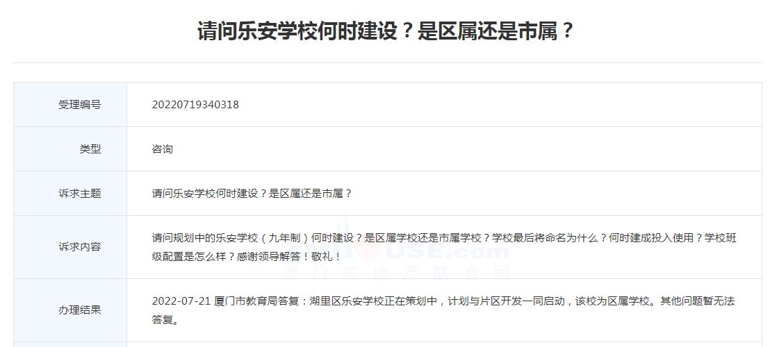 對此,廈門市教育局答復(fù):湖里區(qū)樂安學(xué)校正在策劃中,計劃與片區(qū)開發(fā)一同啟動,該校為區(qū)屬學(xué)校。其他問題暫無法答復(fù)。