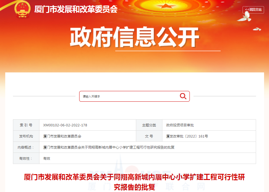 近日,廈門市發(fā)展和改革委員會發(fā)布關(guān)于同翔高新城內(nèi)厝中心小學(xué)擴(kuò)建工程可行性研究報告的批復(fù),同意建設(shè)同翔高新城內(nèi)厝中心小學(xué)擴(kuò)建工程。
