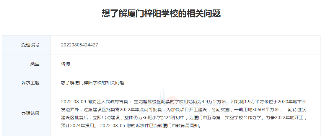 對(duì)此,同安區(qū)人民政府答復(fù): 寶龍旭輝樓盤配套的學(xué)校用地仍為4.9萬(wàn)平方米,因北側(cè)1.9萬(wàn)平方米位于2020年城市開發(fā)邊界外,過(guò)渡建設(shè)區(qū)批復(fù)需2022年年底尚可批復(fù),為加快項(xiàng)目開工建設(shè),分期實(shí)施,一期用地30603平方米,二期待過(guò)渡建設(shè)區(qū)批復(fù)后,立即啟動(dòng)建設(shè),整體仍為36班小學(xué)加24班初中,為廈門市五緣第二實(shí)驗(yàn)學(xué)校合作辦學(xué)。力爭(zhēng)2022年底開工,預(yù)計(jì)2024年投用。
