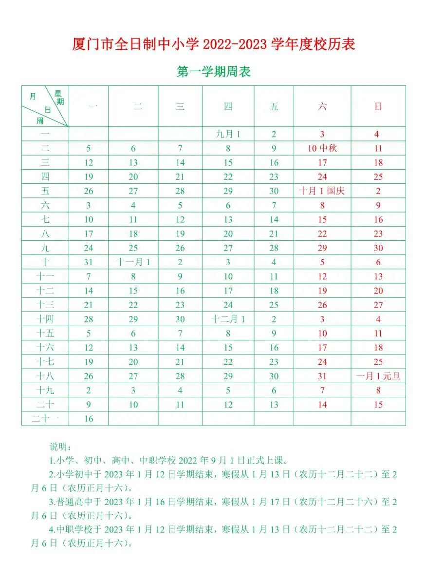 廈門市全日制中小學(xué)2022-2023學(xué)年度校歷表