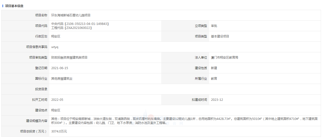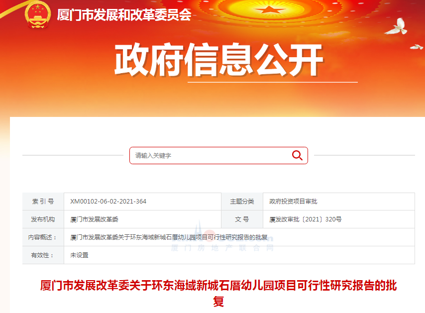 近日,廈門市發(fā)展改革委發(fā)布關(guān)于環(huán)東海域新城石厝幼兒園項(xiàng)目可行性研究報(bào)告的批復(fù),同意建設(shè)環(huán)東海域新城石厝幼兒園項(xiàng)目。