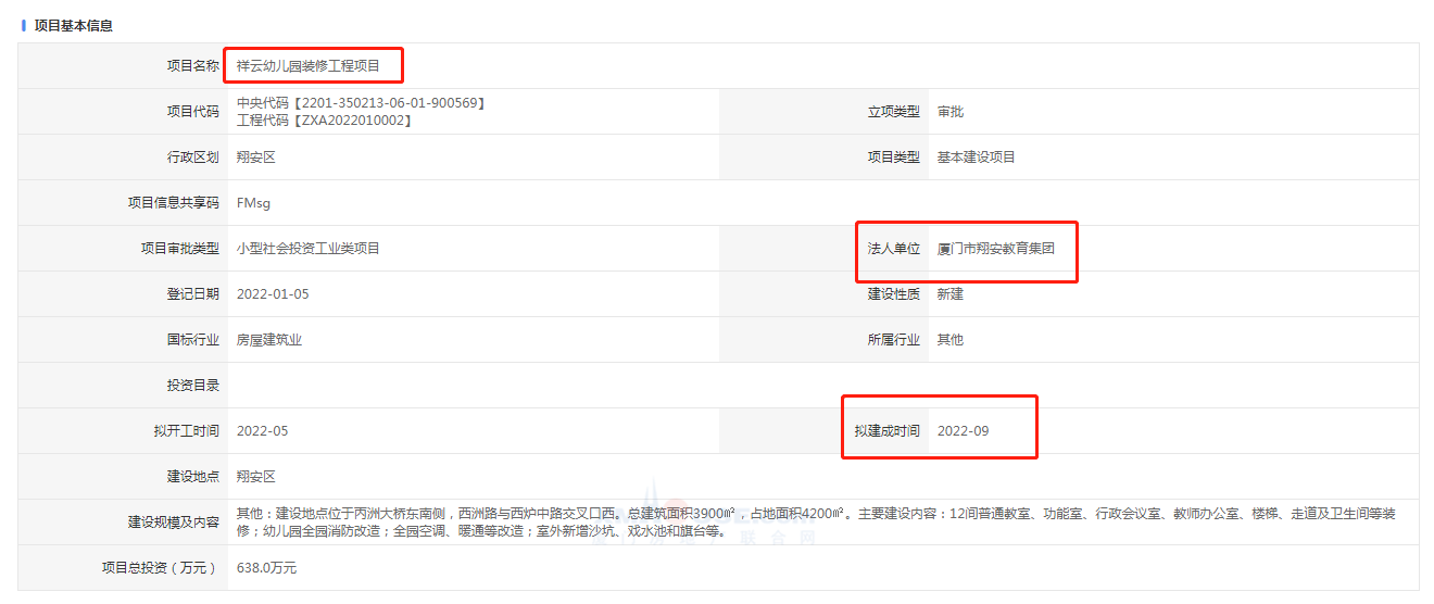 項(xiàng)目法人單位為廈門市翔安教育集團(tuán),總投資約638萬(wàn)元,計(jì)劃今年5月開工,預(yù)計(jì)9月建成。