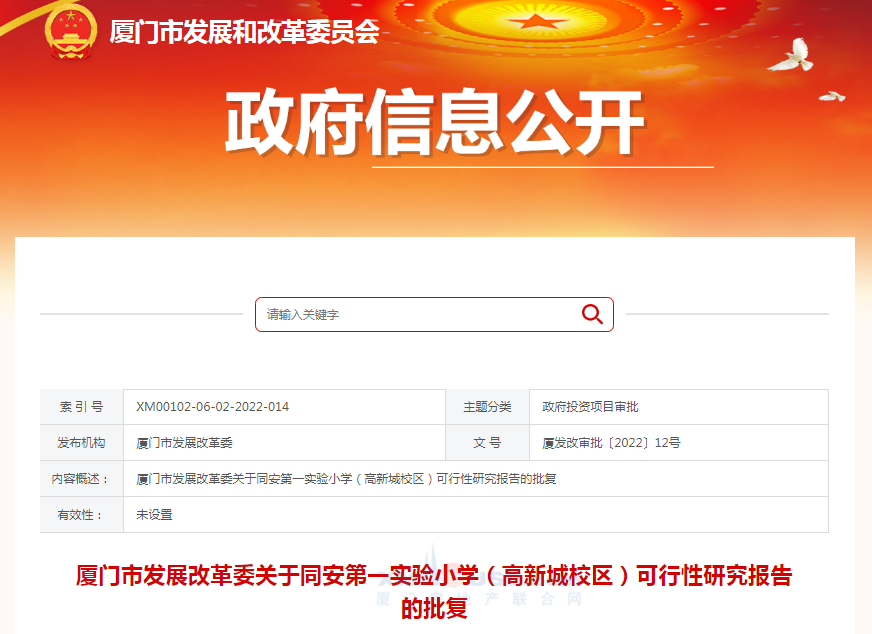 近日,廈門市發(fā)展改革委發(fā)布關于同安第一實驗小學(高新城校區(qū))可行性研究報告的批復,同意建設同安第一實驗小學(高新城校區(qū))。