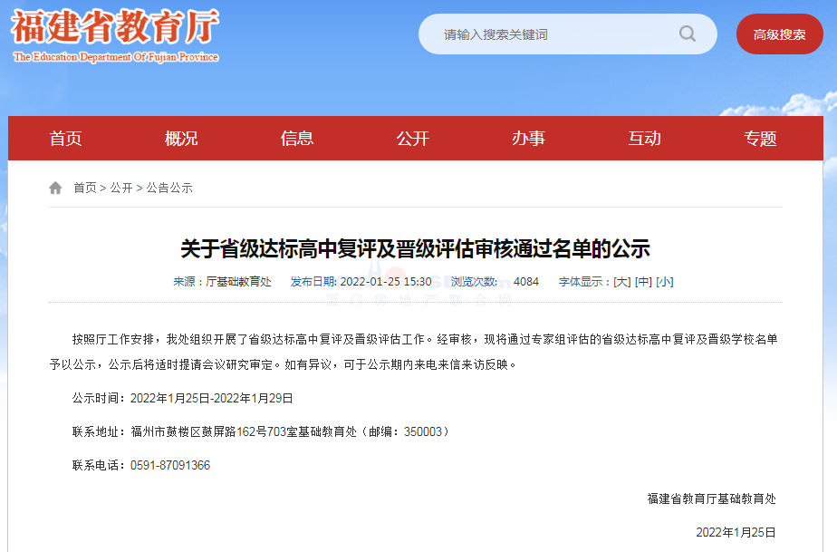 1月25日,福建省教育廳發(fā)布關(guān)于省級達(dá)標(biāo)高中復(fù)評及晉級評估審核通過名單的公示。