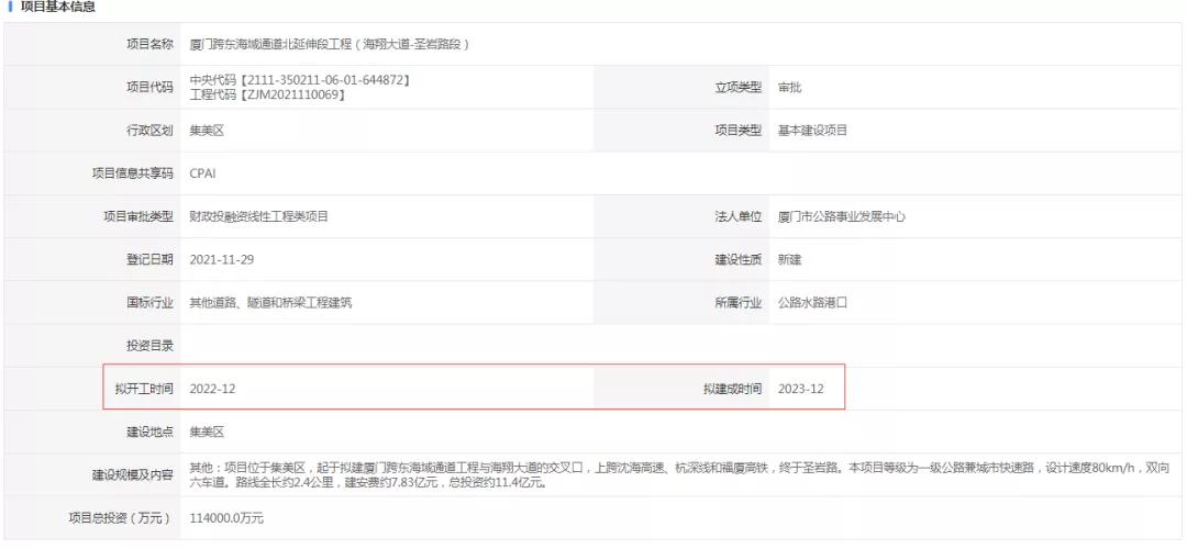 需要指出的是,早在2021年11月底,廈門跨東海域通道北延伸段工程(海翔大道-圣巖路段)就已發(fā)布項(xiàng)目報(bào)建信息,項(xiàng)目位于集美區(qū),起于擬建跨東海域通道工程與海翔大道的交叉口,上跨沈海高速、杭深線和福廈高鐵,終于圣巖路。