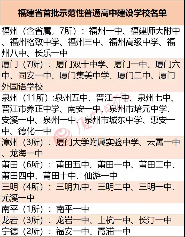 這些學(xué)校經(jīng)過四年(2018年到2021年)建設(shè),選出大約35所左右的“福建省首批示范性普通高中”。昨天最終公布的30所學(xué)校,就是從44所建設(shè)學(xué)校再次評估挑選,擬確認(rèn)為“福建省首批示范性普通高中”。