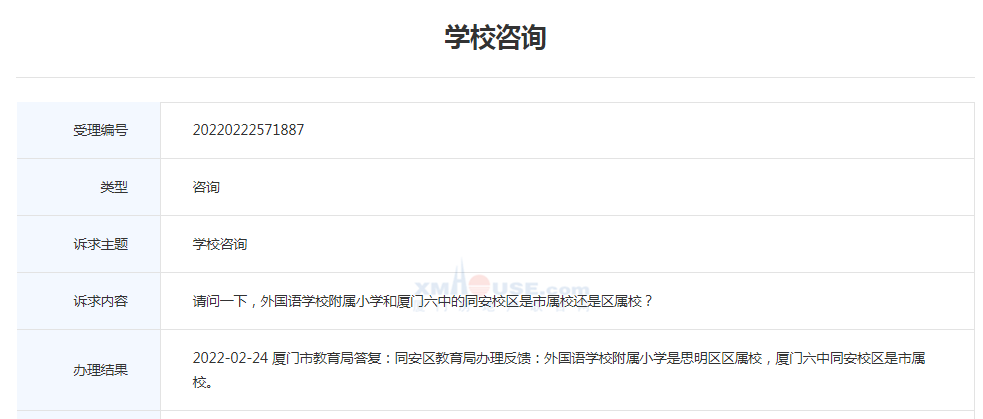 廈門市教育局答復(fù):同安區(qū)教育局辦理反饋:外國(guó)語學(xué)校附屬小學(xué)是思明區(qū)區(qū)屬校,廈門六中同安校區(qū)是市屬校。