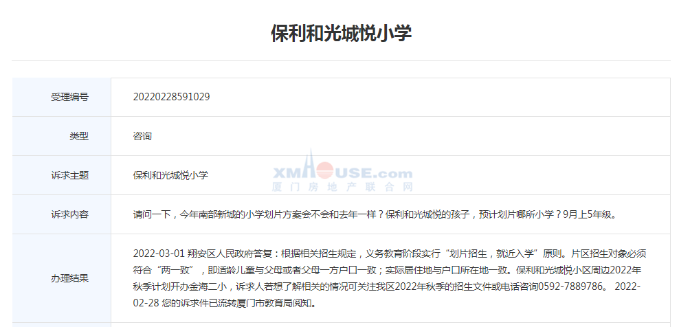 對(duì)此, 翔安區(qū)人民政府答復(fù):根據(jù)相關(guān)招生規(guī)定,義務(wù)教育階段實(shí)行“劃片招生,就近入學(xué)”原則。片區(qū)招生對(duì)象必須符合“兩一致”,即適齡兒童與父母或者父母一方戶口一致;實(shí)際居住地與戶口所在地一致。保利和光城悅小區(qū)周邊2022年秋季計(jì)劃開辦金海二小。
