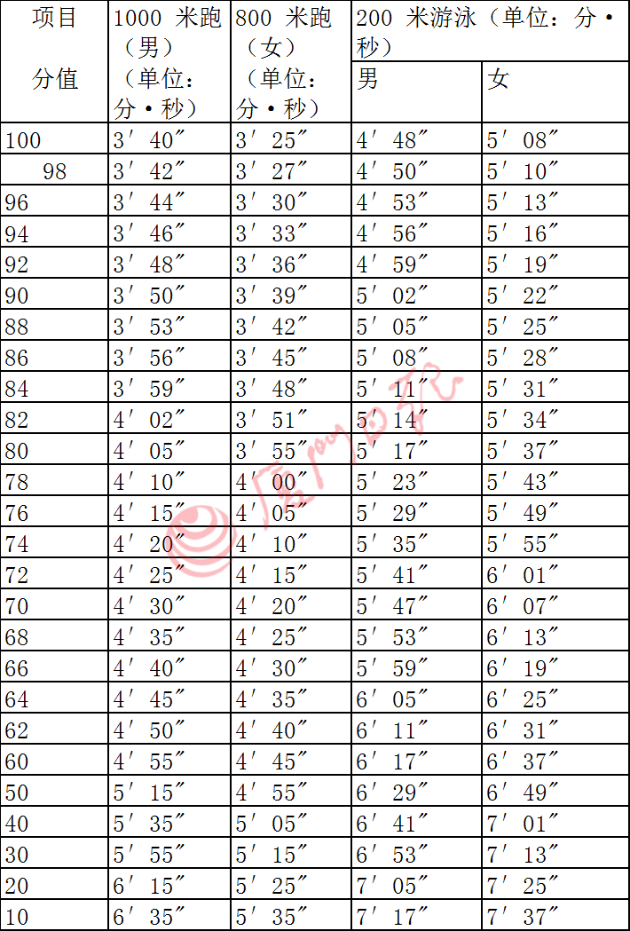 其次,非筆試的每個項目都是以100分計,例如男子1000米,該項目分值為15分,如果得了90分,那么,這90分換算后為13.5分;再譬如女子1分鐘跳繩,分值為8分,跳了158下,得分92分,換算后為7.36分