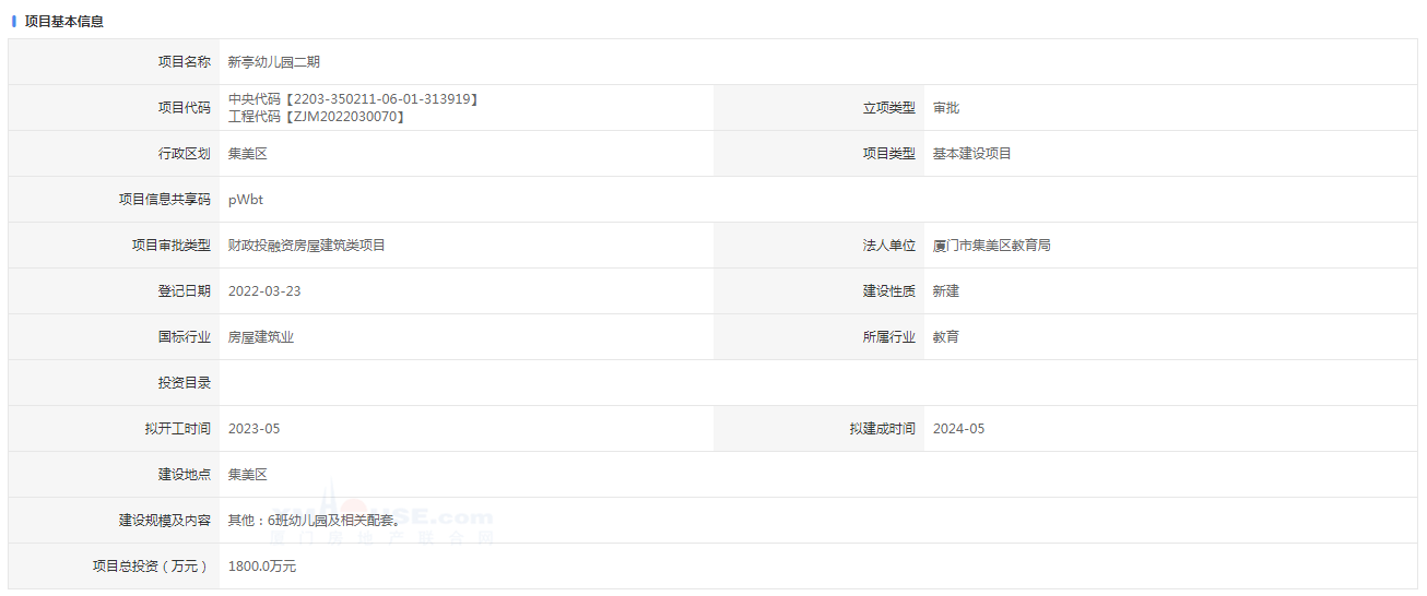 項目位于集美區(qū)灌口鎮(zhèn)新亭幼兒園西北側(cè),擬建6班幼兒園及相關(guān)配套。項目總投資約1800萬元,計劃2023年5月開工,預(yù)計2024年5月建成。