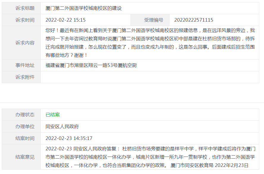 針對兩所學校位置不同,辦學規(guī)模不同,同安區(qū)人民政府回復了:杜橋舊貨市場旁要建的是祥平中學,祥平中學建成后將作為廈門市第二外國語學校的城南校區(qū)一體化辦學,城南片區(qū)新增一所九年一貫制學校,也作為第二外國語學校城南校區(qū),一體化辦學,也符合當前集團化辦學的政策。