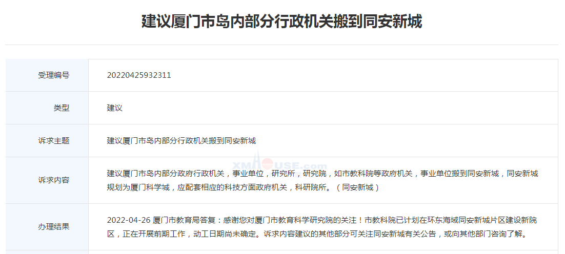 對(duì)此,廈門市教育局答復(fù):感謝您對(duì)廈門市教育科學(xué)研究院的關(guān)注!市教科院已計(jì)劃在環(huán)東海域同安新城片區(qū)建設(shè)新院區(qū),正在開展前期工作,動(dòng)工日期尚未確定。訴求內(nèi)容建議的其他部分可關(guān)注同安新城有關(guān)公告,或向其他部門咨詢了解。