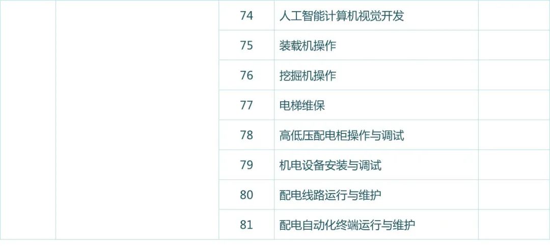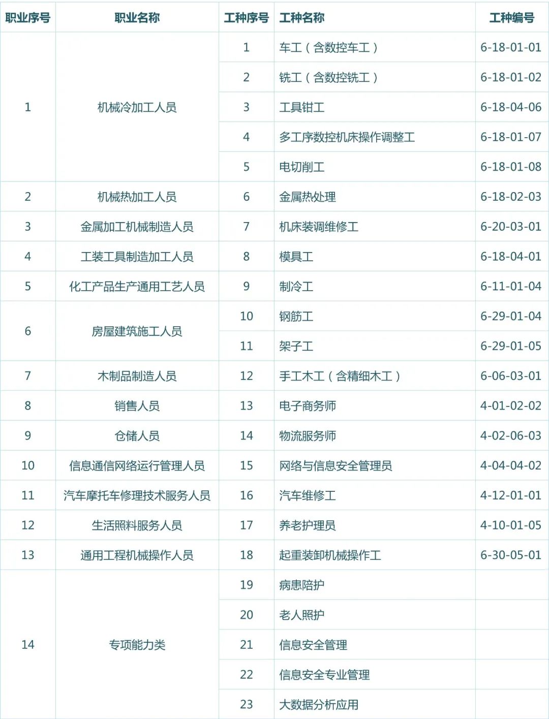 | 職業(yè)序號(hào) | 職業(yè)名稱 | 工種序號(hào) | 工種名稱 | 工種編號(hào) |