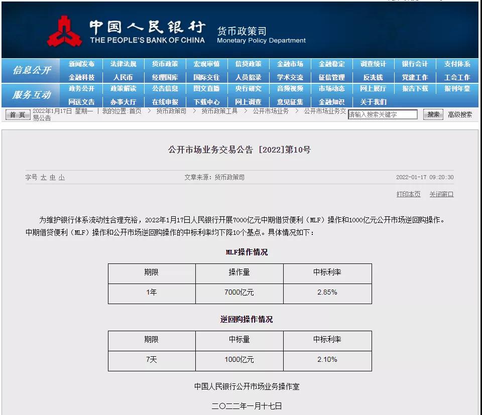 為維護(hù)銀行體系流動性合理充裕,2022年1月17日人民銀行開展7000億元中期借貸便利(MLF)操作和1000億元公開市場逆回購操作。中期借貸便利(MLF)操作和公開市場逆回購操作的中標(biāo)利率均下降10個(gè)基點(diǎn)。