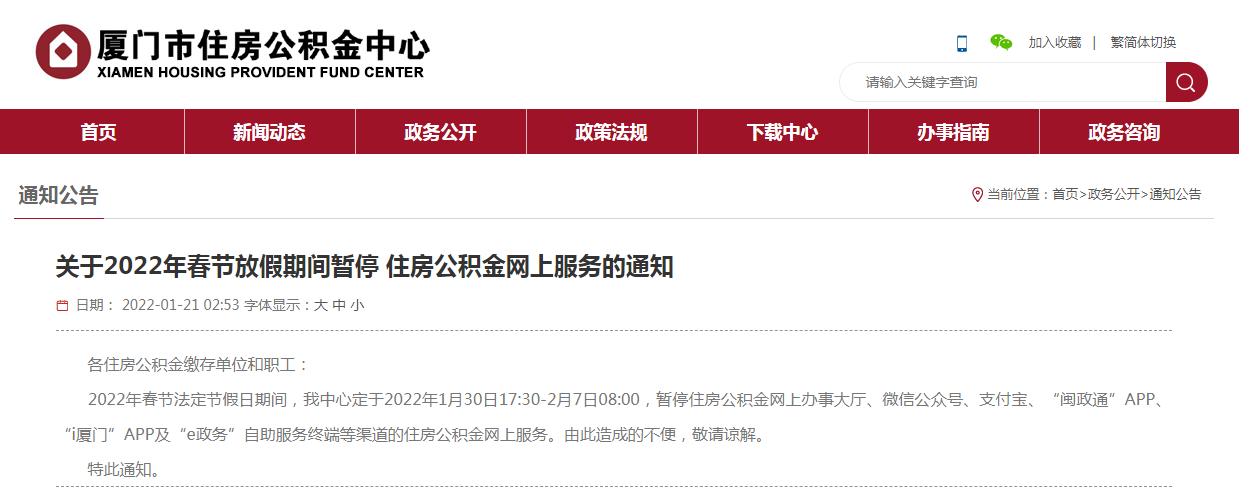 注意!2022年春節(jié)法定節(jié)假日期間,廈門市住房公積金中心定于2022年1月30日17:30-2月7日08:00,暫停住房公積金網(wǎng)上辦事大廳、微信公眾號(hào)、支付寶、“閩政通”APP、“i廈門”APP及“e政務(wù)”自助服務(wù)終端等渠道的住房公積金網(wǎng)上服務(wù)。