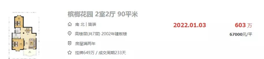 今年1月份檳榔花園,成交了一套建面約90平米的2室2廳二手房,該房源掛牌價649萬,最終以603萬的總價成交,折算單價達(dá)6.7萬/㎡。