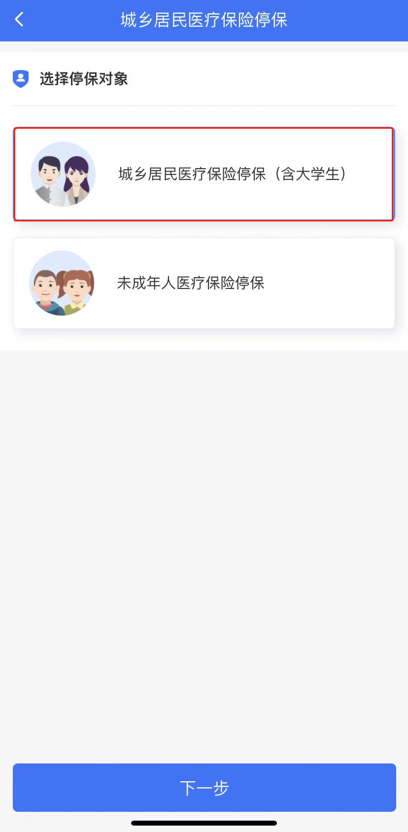 ?。?)選擇停保對象“城鄉(xiāng)居民醫(yī)療保險停保(含大學(xué)生)”,點擊下一步;