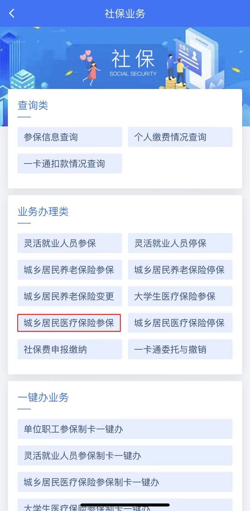 (1)登錄首頁后,選擇“辦稅”-“社保業(yè)務(wù)”,點(diǎn)擊“城鄉(xiāng)居民醫(yī)療保險(xiǎn)參保”;