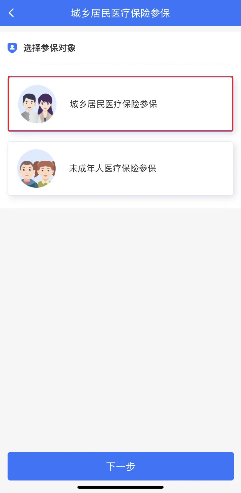 (2)選擇參保對(duì)象“城鄉(xiāng)居民醫(yī)療保險(xiǎn)參保”,點(diǎn)擊下一步;