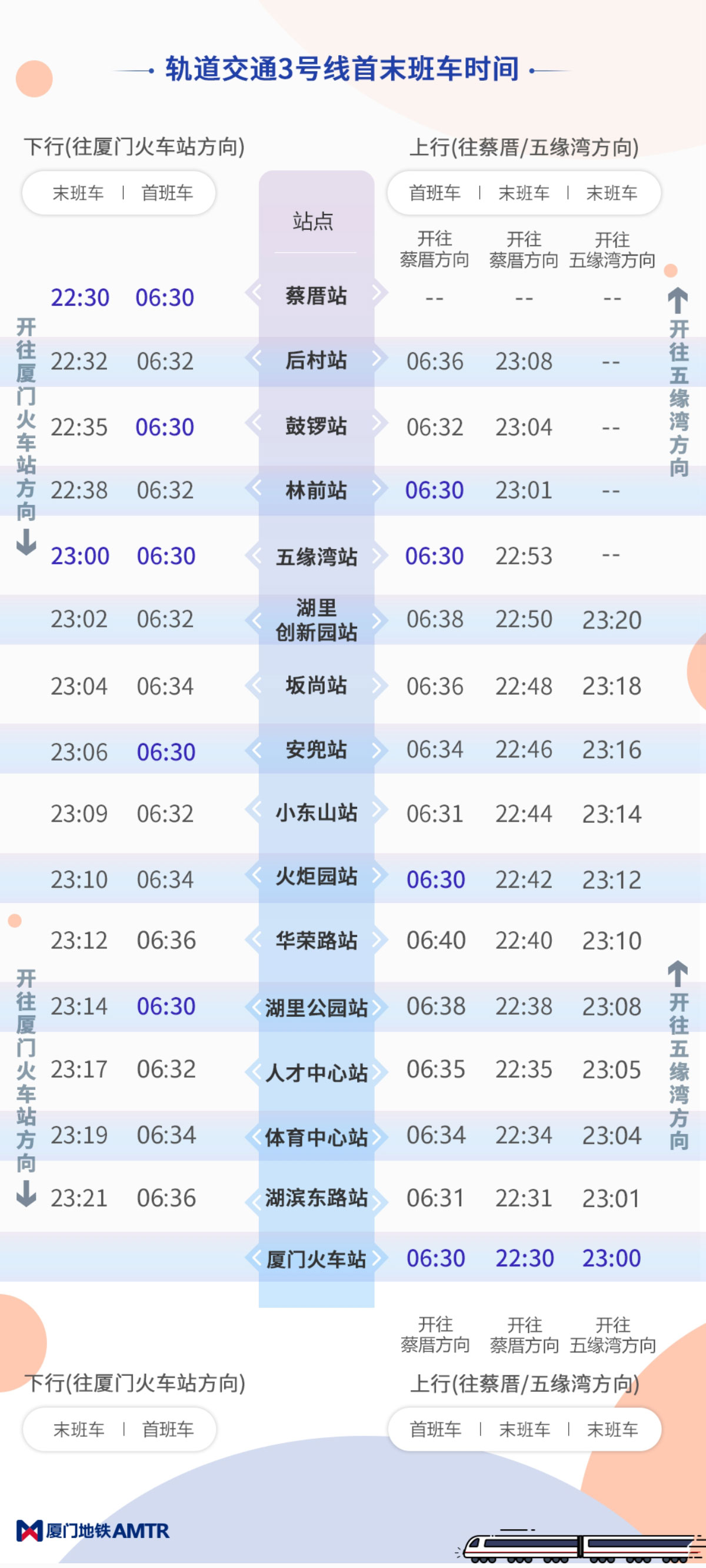 小交路(廈門火車站—五緣灣站)、(五緣灣站—廈門火車站)末班車發(fā)車時間為23:00。