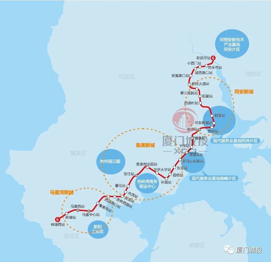 地鐵6號線介紹:連接海滄、集美、同安三個行政區(qū),全長46.2公里,共設(shè)33座車站,起于海滄東孚鎮(zhèn)林埭,終于同安五顯鎮(zhèn)新店仔,串聯(lián)了馬鑾灣新城、杏林老城區(qū)、集美新城、同安新城、同安老城區(qū)等大型居住區(qū),途經(jīng)新陽工業(yè)區(qū)、杏林灣商務(wù)運營中心、廈門現(xiàn)代服務(wù)業(yè)基地丙洲片區(qū)、現(xiàn)代服務(wù)業(yè)基地美峰片區(qū)、同翔高新技術(shù)產(chǎn)業(yè)基地同安片區(qū)等制造業(yè)和現(xiàn)代服務(wù)產(chǎn)業(yè)園區(qū)。