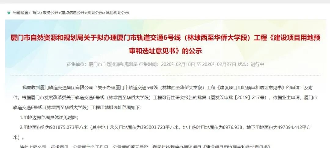 廈門市自然資源和規(guī)劃局關(guān)于擬辦理廈門市軌道交通6號線(林埭西至華僑大學(xué)段)工程《建設(shè)項目用地預(yù)審和選址意見書》的公示
