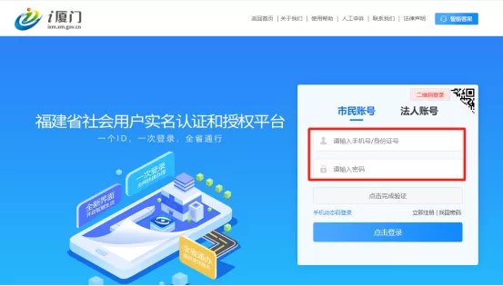 2.手機(jī)號(hào)或身份證號(hào)碼進(jìn)行注冊(cè),如已有i廈門(mén)賬戶(hù)的直接用i廈門(mén)賬戶(hù)登錄;