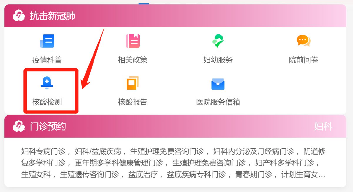 關注“美麗廈門智慧健康”微信公眾號,選擇“廈門市婦幼保健院”,成人預約“新冠核酸檢測”,兒童預約“兒科門診”。