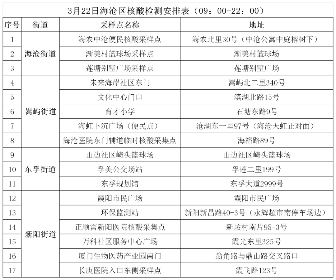 海滄區(qū)核酸采樣點(diǎn)安排表