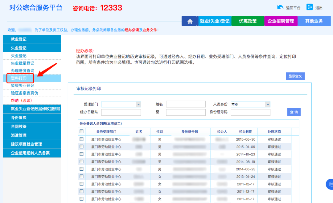 需要打印資料的用人單位,可直接在“資料打印”模塊打印《解除勞動關(guān)系證明》和《失業(yè)登記備案表》。
