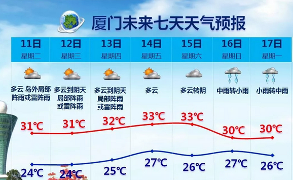 氣象部門預(yù)計,今天有一股冷空氣滲透南下,影響廈門,風(fēng)力會略有增強。今天白天的最高氣溫會降到25℃左右,涼爽不少。