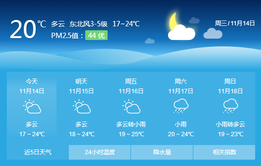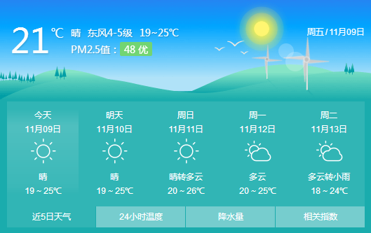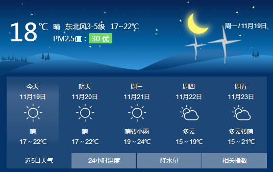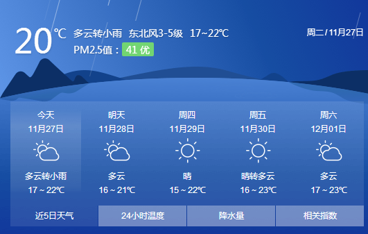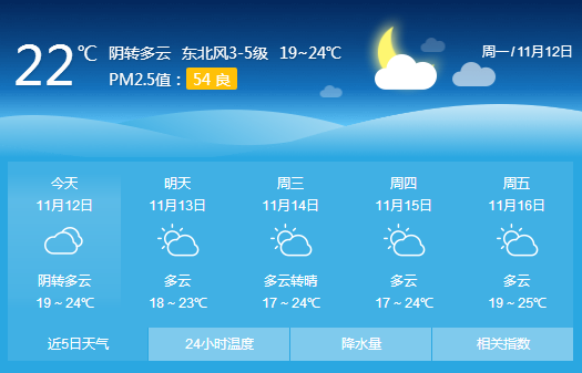 今天17℃~23℃白天:多云到陰天夜間:多云到陰天風(fēng)向:東北風(fēng)3~4級濕度:60%~85%明天18℃~24℃全天:多云到陰天風(fēng)向:東北風(fēng)3~4級減弱到2~3級后天19℃~24℃全天:多云到陰天風(fēng)向:東北風(fēng)2~3級市氣象臺昨日22時發(fā)布。