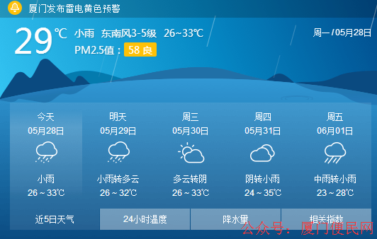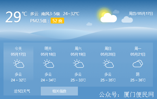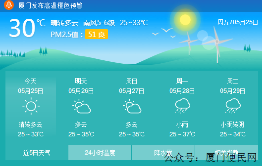 廈門便民網(wǎng)訊:昨天,在副高控制下,廈門又是晴熱的一天。島內(nèi)午間最高氣溫達到34℃左右,島外海滄、集美、同安部分地區(qū)則達到35℃。