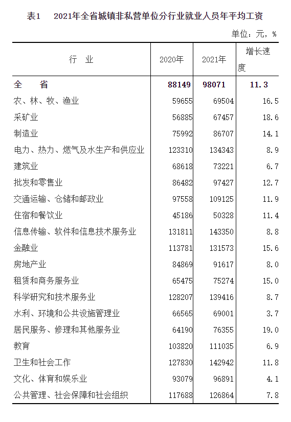 就業(yè)人員年平均工資增幅最高的三個行業(yè)依次為居民服務、修理和其他服務業(yè)增長19.0%,采礦業(yè)增長18.6%,農(nóng)、林、牧、漁業(yè)增長16.5%。增幅最低的三個行業(yè)依次為水利、環(huán)境和公共設施管理業(yè)增長3.7%,文化、體育和娛樂業(yè)增長4.1%,建筑業(yè)增長6.7%。全部19個行業(yè)門類中,有10個行業(yè)的平均工資增幅高于全省平均水平。